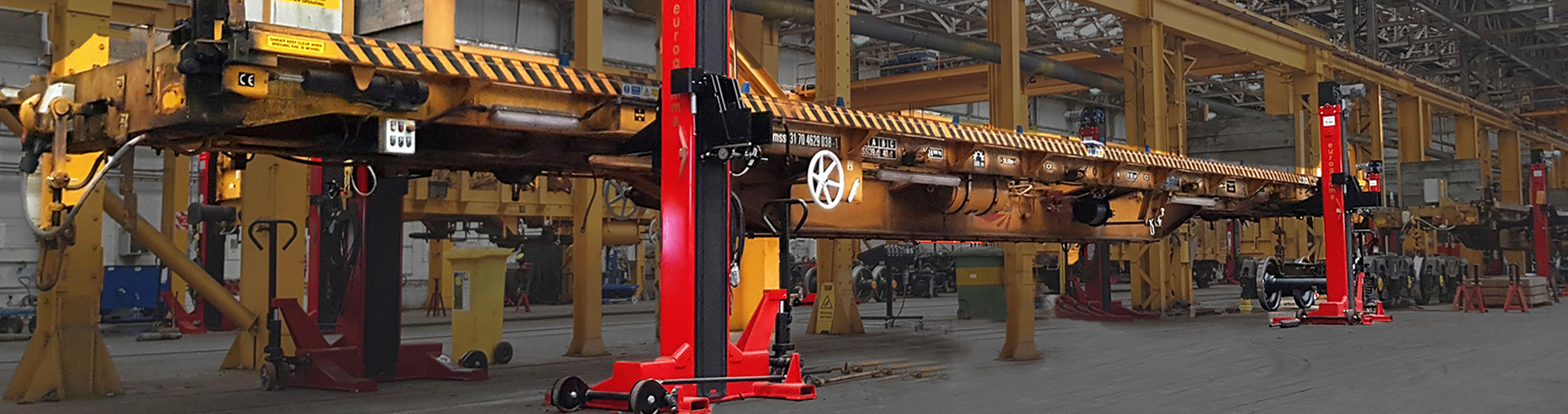 Sistemi di sollevamento e di manutenzione, per ogni genere di materiale rotabile. Le colonne di sollevamento, grazie ad una struttura che permette un’alta capacità di carico con peso limitato, possono essere facilmente spostate su pavimentazioni industriali piane, per essere portate nella postazione di sollevamento ed essere posizionate sotto il carico. Ogni colonna di un gruppo è comandata individualmente per una corretta e sicura presa in forza del carico. Controllabili da una o più centraline, le colonne possono essere collegate per formare gruppi di sollevamento di 4, 8, 12 o più colonne. La sincronizzazione consente la riequilibratura automatica delle colonne che sollevano uno stesso rotabile e fra i gruppi di colonne che sollevano un intero treno. Il progetto modulare delle centraline consente all’operatore di definire il numero di gruppi di uno stesso sistema di sollevamento ed il numero di colonne di ogni gruppo, nonché il numero di operatori necessari alla supervisione del sollevamento.
