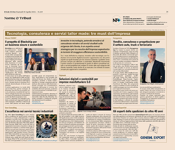 VENDITA, CONSULENZA E PROGETTAZIONE PER IL SETTORE AUTO, TRUCK E FERROVIARIO, "IL SOLE 24"
